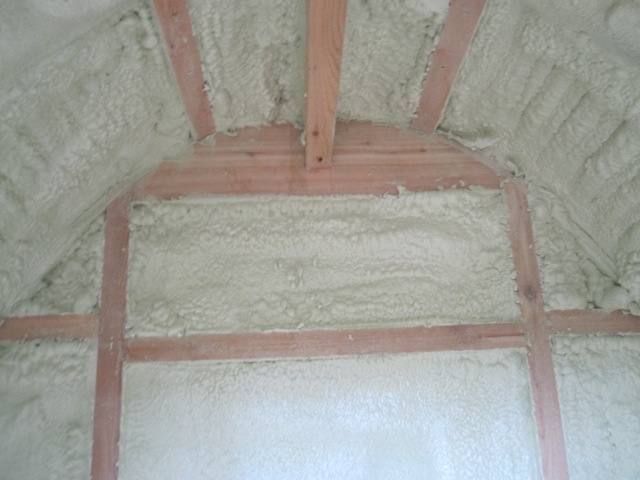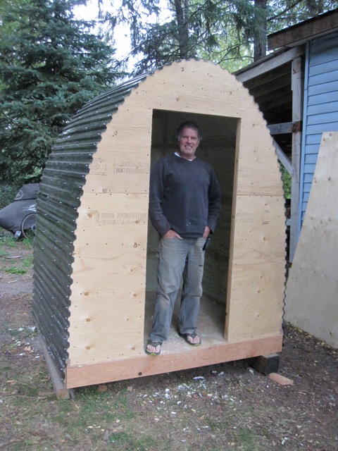 The design process involved a team of six lead by Ian Stokie see below in the door of the outhouse. Ian said, “We built the outhouse as a scaled down replica of the cabin to learn how to work with the materials. The structure is made of PVC piping supported by wood frame and spray foamed for strength and insulation. The challenge was to make it light enough to fly in by helicoper and strong enough to survive the elements.”