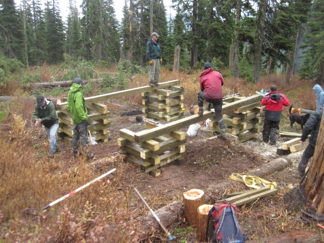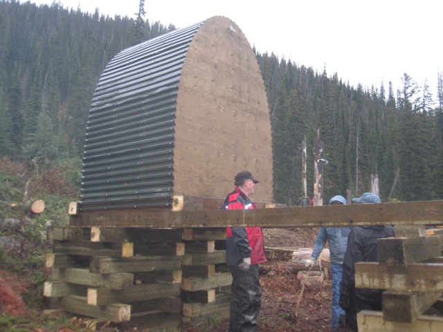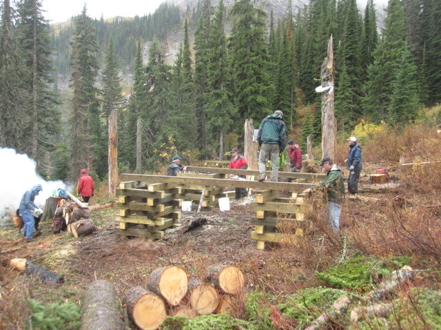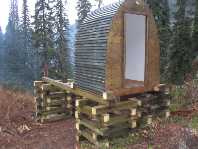 The outhouse is sitting in place and the cribbing supports await the arrival of the main cabin. Here are some pictures than tell a piece of the tale however by no means communicate the many hours of volunteer work. (click for a larger view)