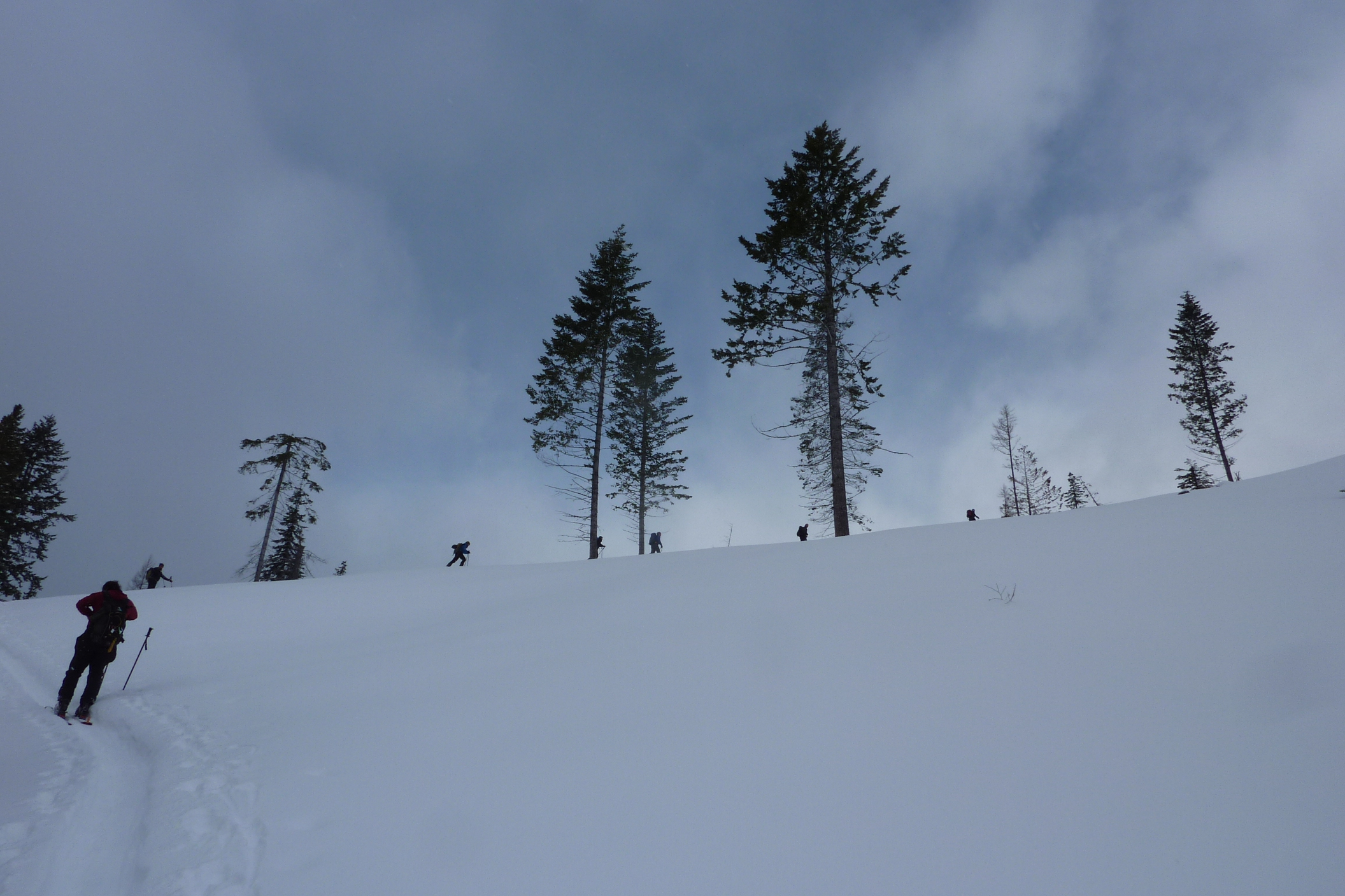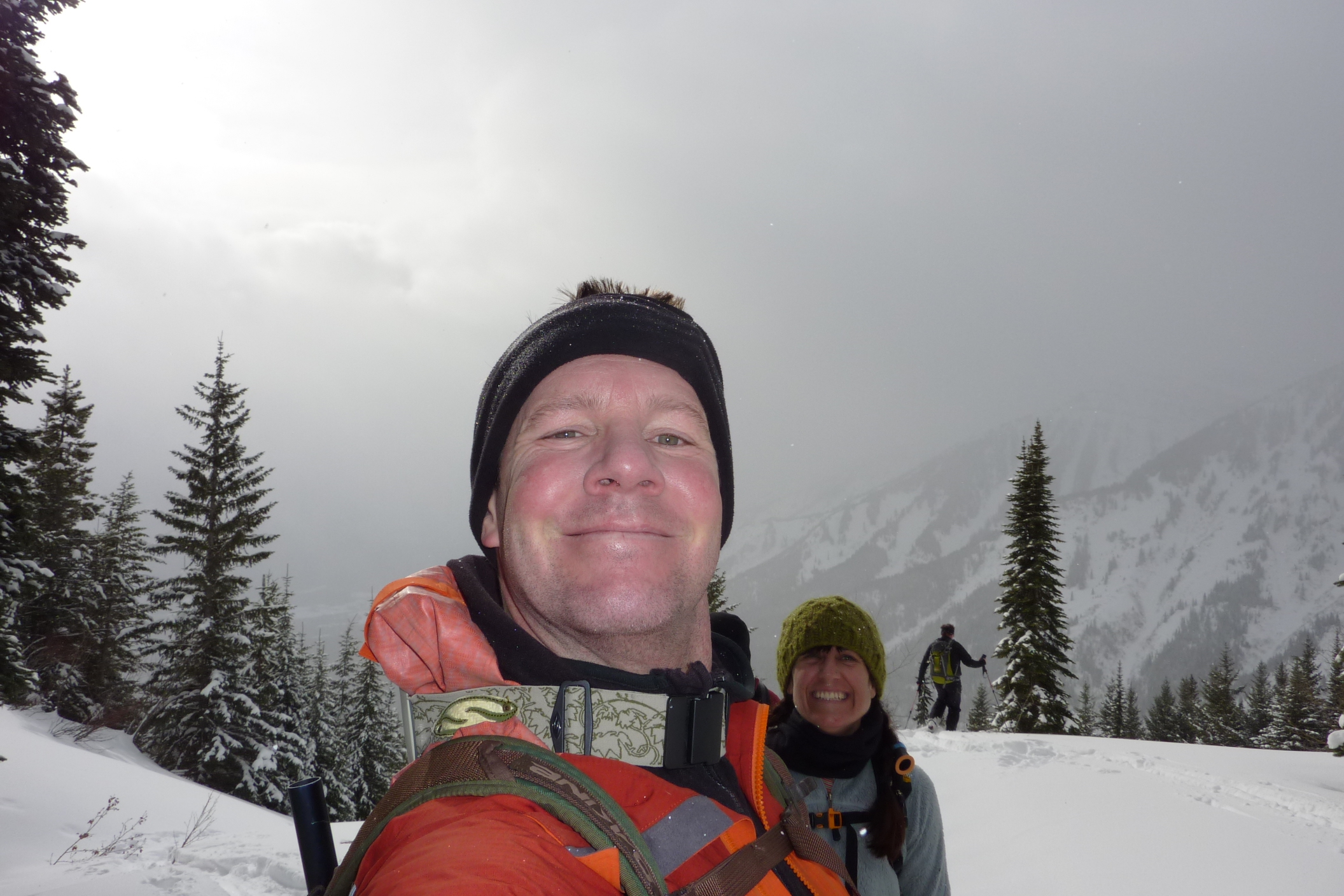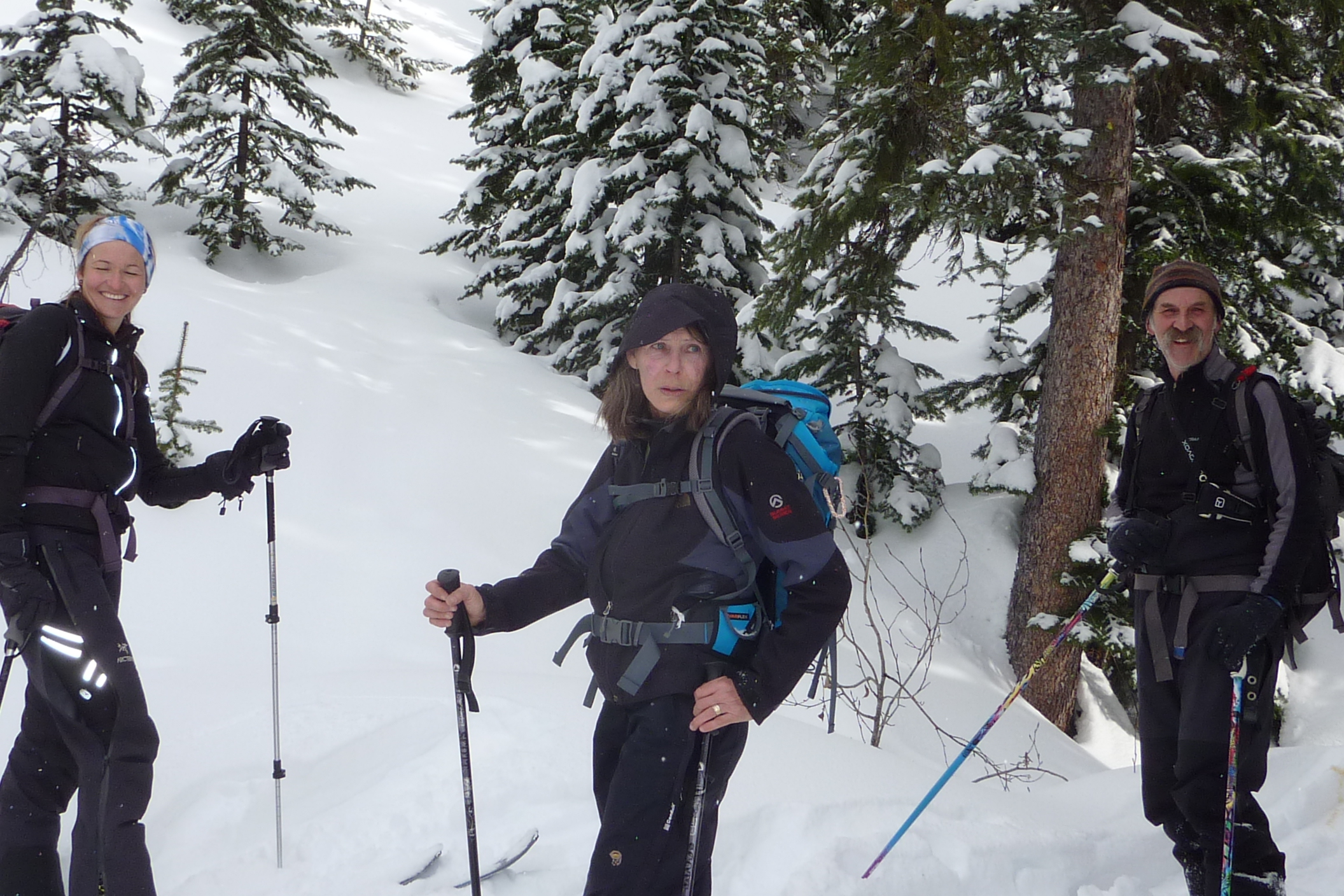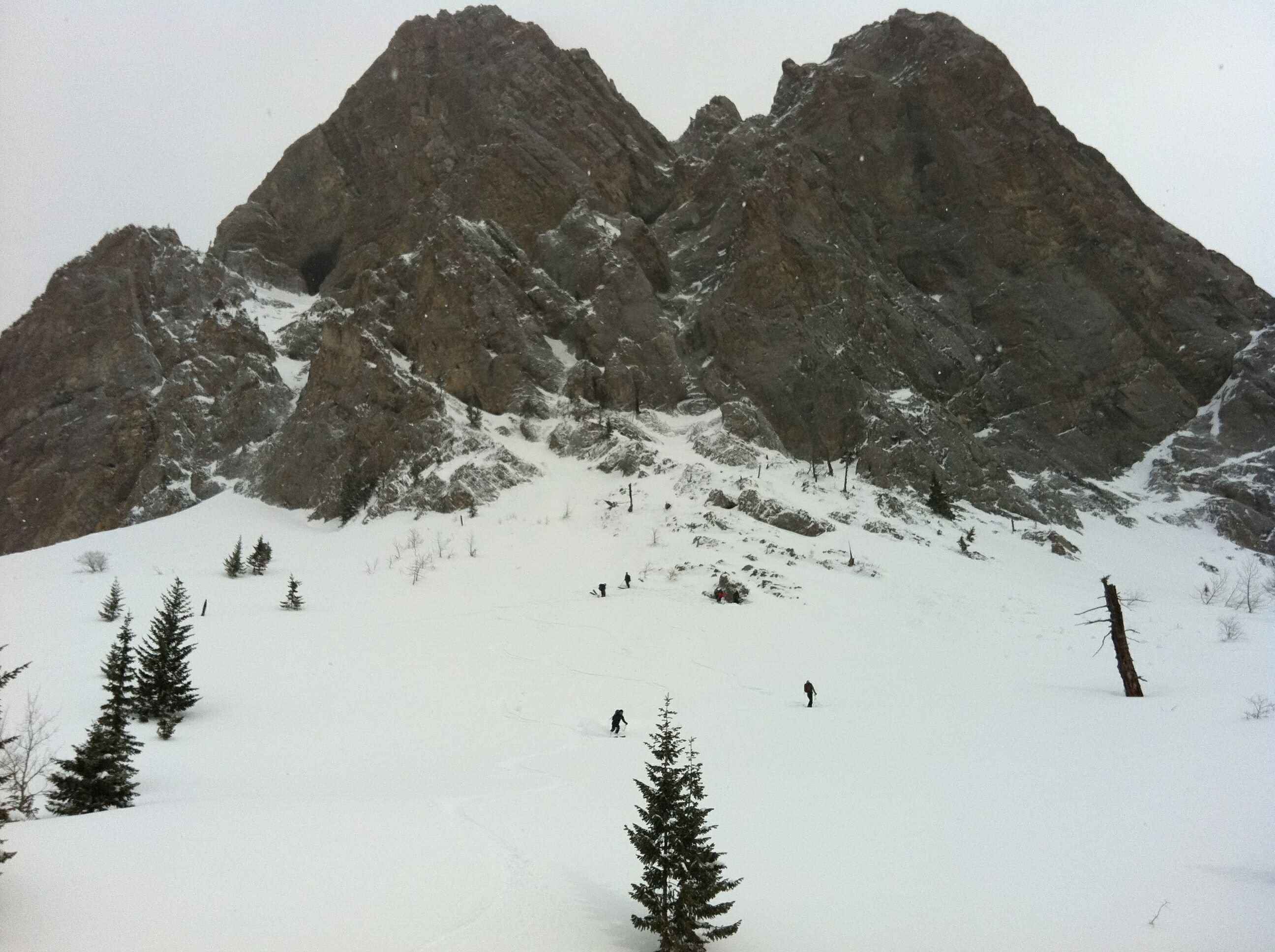 Group of eight of us made some nice turns today under the Ghostrider Peak on Hosmer Mtn. The clear-cuts below the cliffs are pleasant 20 to 30 degree slopes and the alpine just below the rocks increases to 35 degrees. Snowpack is highly variable between 1.5 meters down to .5 meter on the windblown exposed slopes. Had 15 cm of powder on top of the solid base and the avalanche hazard was significantly higher below the cliffs (shallow snowpack with depth hoar under the crust). Climbed up to 1800 meters elevation and got 400 to 500 meter descents back to the access road.