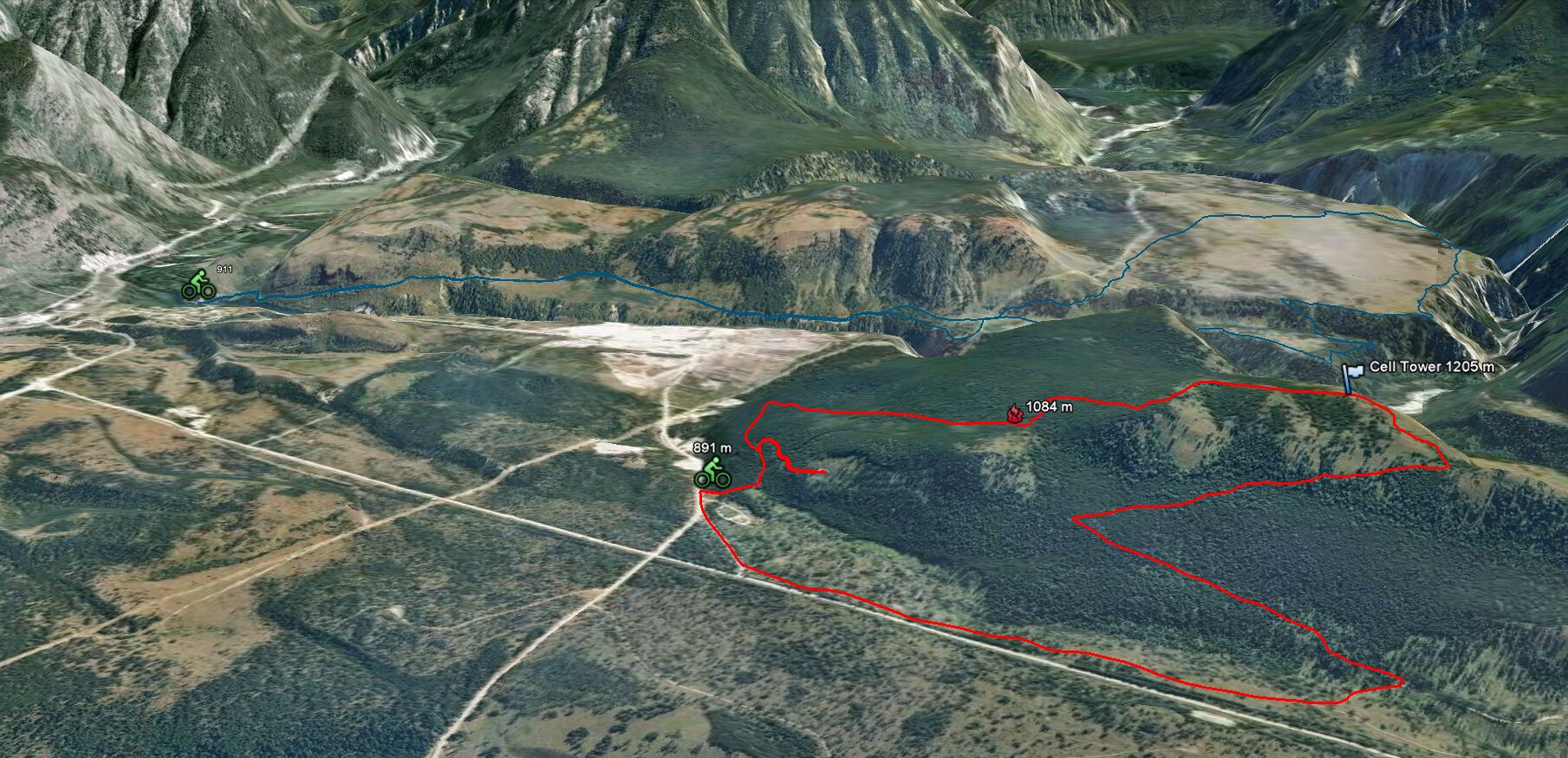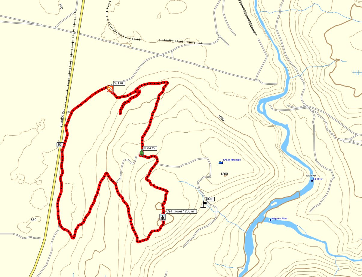 Sheep Mountain is riding pretty good this April. Best to ride clockwise from just past the Elko Transfer Station (on Elko Mill haul road) and go up the new Sheep Mountain Road (signed). Near the start of the ride make sure to take the left fork in the first 1/2 km of climbing, the right fork climbs steep and ends on a log landing. The new road climbs steady for 200 vertical meters and ends at a logging landing (1084m). Walk 50 meters south and join the old road, riding another 100 vertical meters to the summit and Ingy Cell Tower at 1205 meters. At the summit descend southward on the old dirt road on the west side of the Cell Tower, it eventually hooks around back northward and descends down to Highway 93. Continue northward on the dirt road back to where you started.