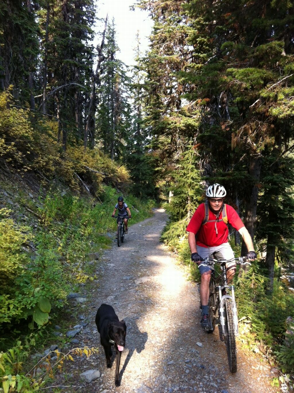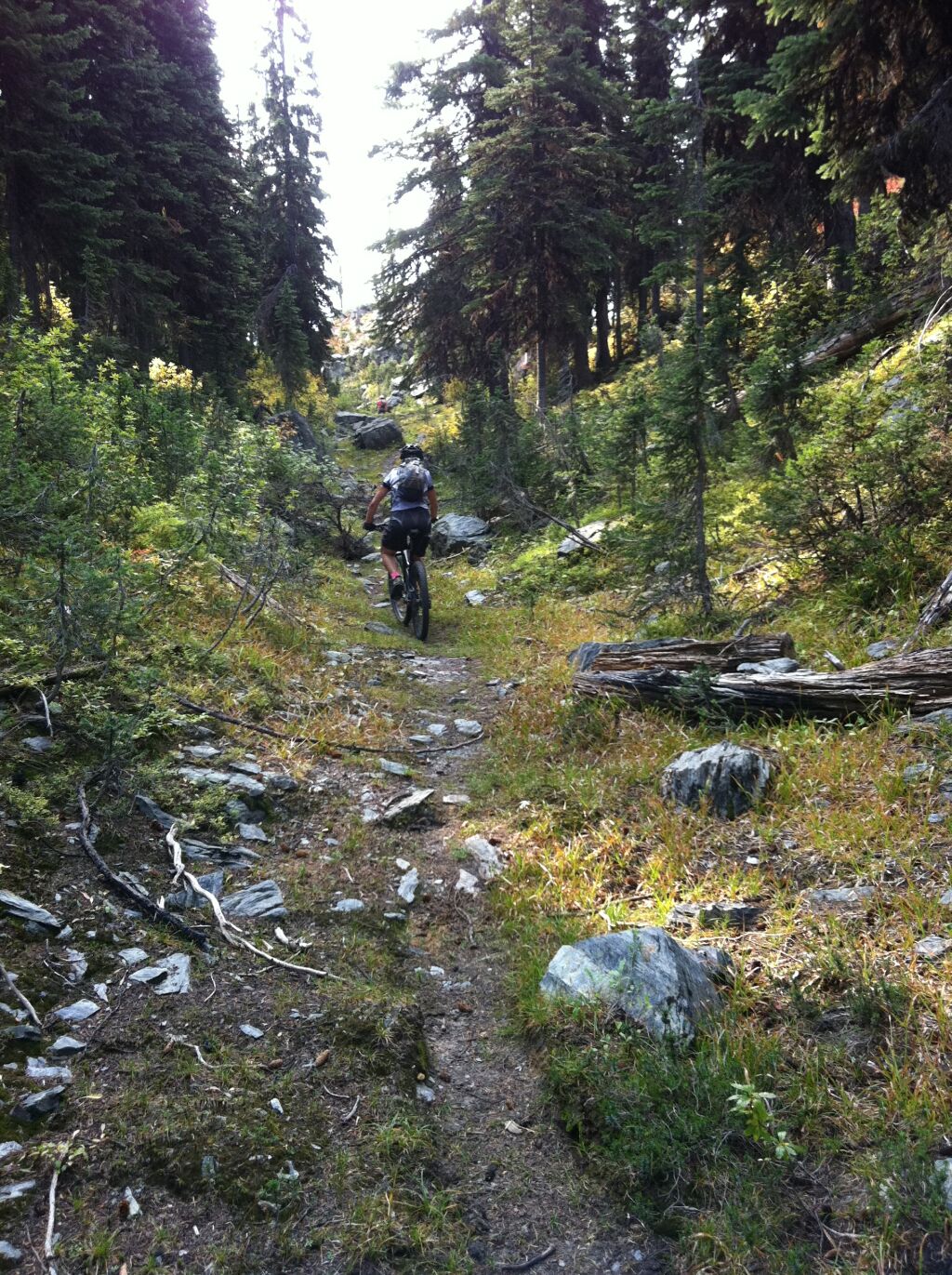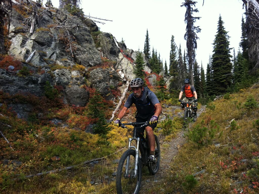 This ride starts as a moderate uphill cycle for two kilometers up a non-motorized old road to the Victor Mine ruins. Then turn west down a horse trail (20m past the collapsed mine structure) and climb for over a kilometer on single-track to the summit col at 2100 meters. The 9 kilometer, 1200 vertical meter descent is rocky and technical in places but our group rode most of it on our cross-country bikes with only a few short dismounts. Finish the ride at Horseshoe Lake recreational area (900m).
