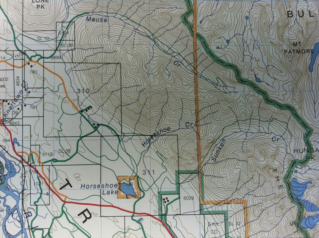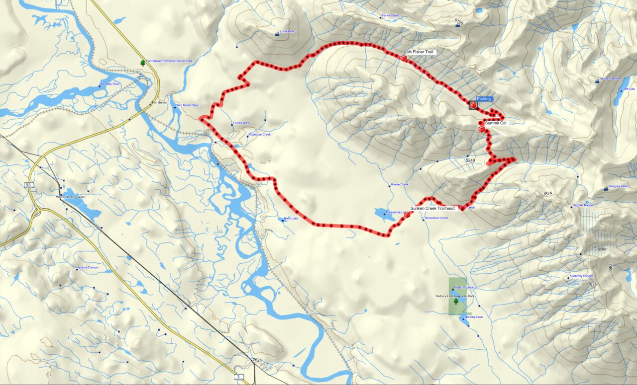 Good mountain bike ride by Mount Fisher, just east of the Wardner-Fort Steele Road and ending at Horseshoe Lake. Can do a 23 kilometer shuttle on the Mause Creek Road and gain 800 vertical meters. At the end of the road ( 3 km past Mt Fisher trailhead) cycle another 3 kilometers and 400 meters vertical to summit at 2100 meters elevation. Single-track descent of 9 kilometers, 1200 vertical meters across Horseshoe Basin and down Sunken Creek Trail to Horseshoe Lake.