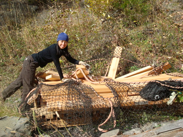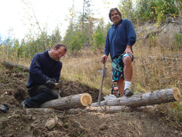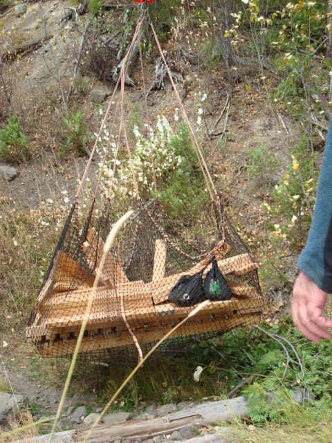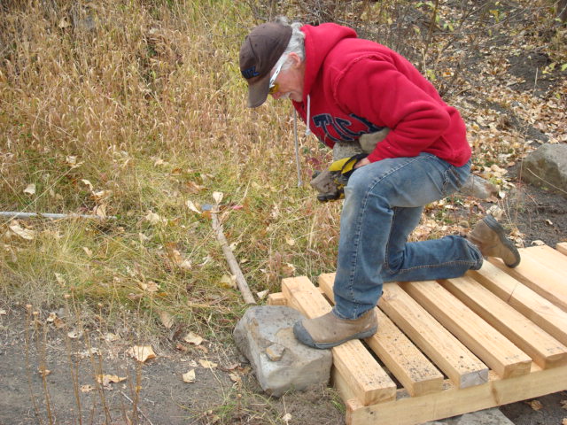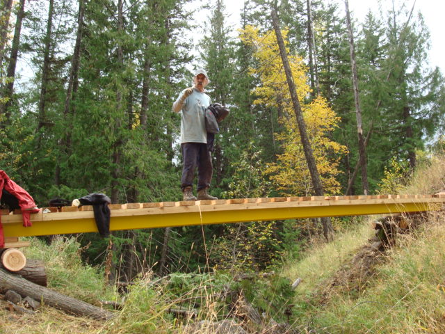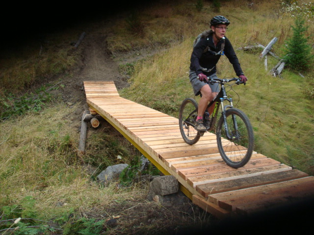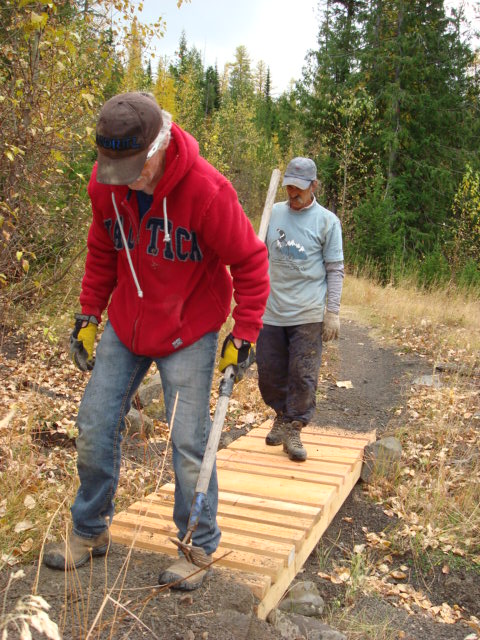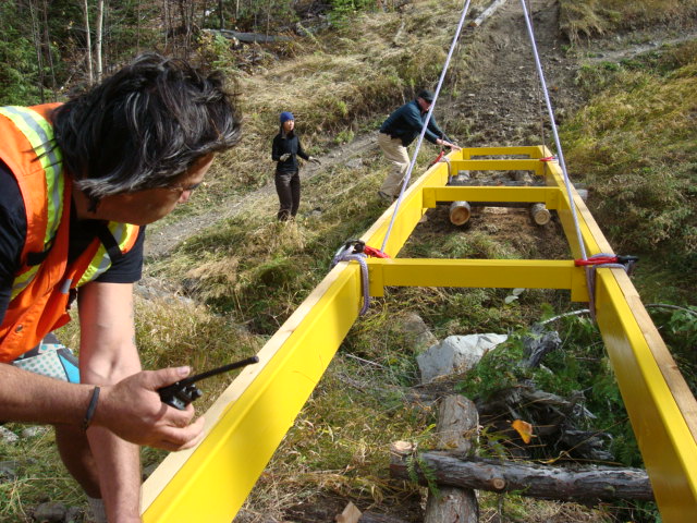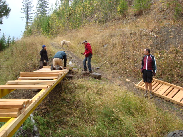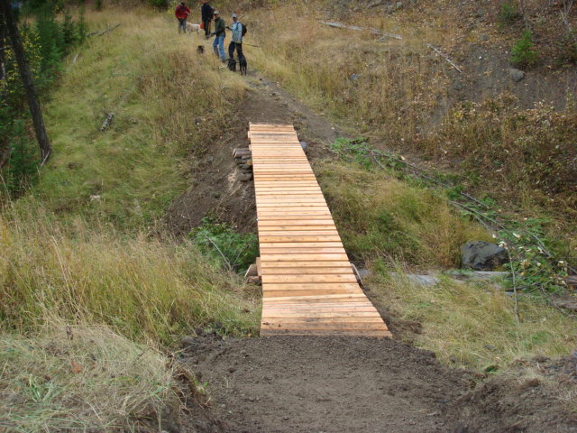 First you start with a 31 foot steel span and several boardwalks of various lengths.Then you send the mule train up the mountain:Then the work starts, grubbing out the earth and building the foundations for the bridge to rest upon: When the cribbing is all built for the bridge:Then you call Greg the helicopter guy from Ascent Helicopters and tell him to bring us a bridge:….and carefully set it into placeNext comes the cedar decking to be fastened to the bridge structure:Then the boards are nailed/screwed onto the bridge:We also put in 5 boardwalk bridges to address wet areas in various spots along the trail:We had a work party of about 10 people and got a lot accomplished, this bridge and the boardwalks will greatly improve the flow of Southern Comfort. Thanks to everyone who came out.
