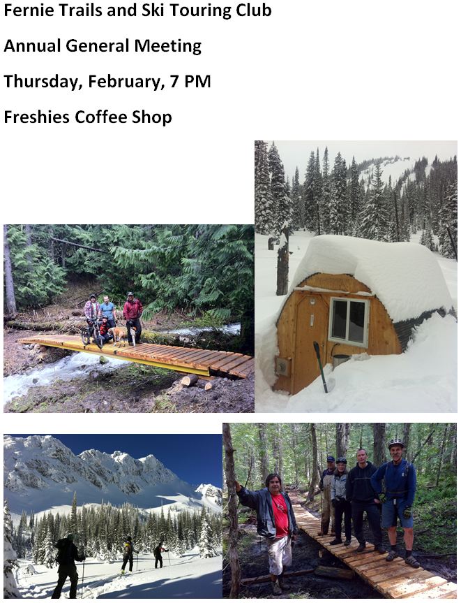 The Fernie Trails and Ski Touring Club is hosting its 2016 Annual General Meeting. Members and new members are welcome to attend. The agenda will be posted here soon. Date: Thursday, February 23, @ 7 PM Place: Silver Rock Condominiums, 1500 McDonald Ave, Fernie, BC V0B 1M1
